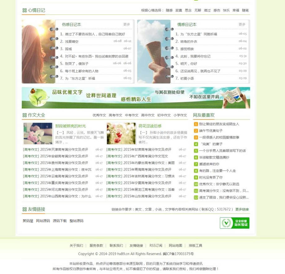 这是一套使用帝国CMS内核开发的新闻文章类网站源码,模板是清新的绿色美文网样式,有在线投稿功能,有独立手机端,非常适合做文章分享、诗文、历史类的站点使用!
