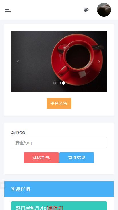 一套运营级的PHP抽奖网站源码/php抽奖活动源码,系统界面简洁、大气,全站使用ajax加载,用户体验良好;奖品概率可后台自己设置,概率算法开放化,具留言板功能可供用户发布此次活动参与感受,更具活动化氛围!另外,奖品介绍支持html标签,折叠式布局节省网页布局空间!