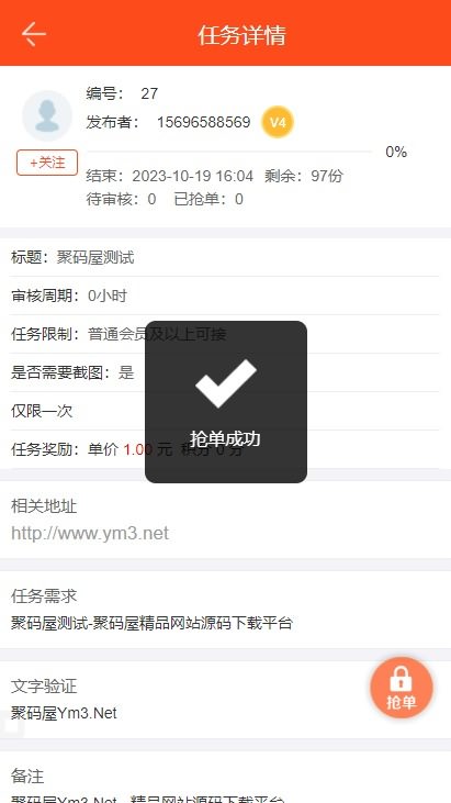 而且,我也截取了大量的图片给大家参考。我所测试到的地方有:用户登录、发布任务、接受任务、提交任务、审核任务、后台的设置保存,一共6项,这6项都是没问题的!还有,注册的短信验证码功能、在线支付功能(使用的码支付)什么的,这些没条件测试的东西,有兴趣的下载后再自行搭建体验吧,当然,介意者和小白请慎下!