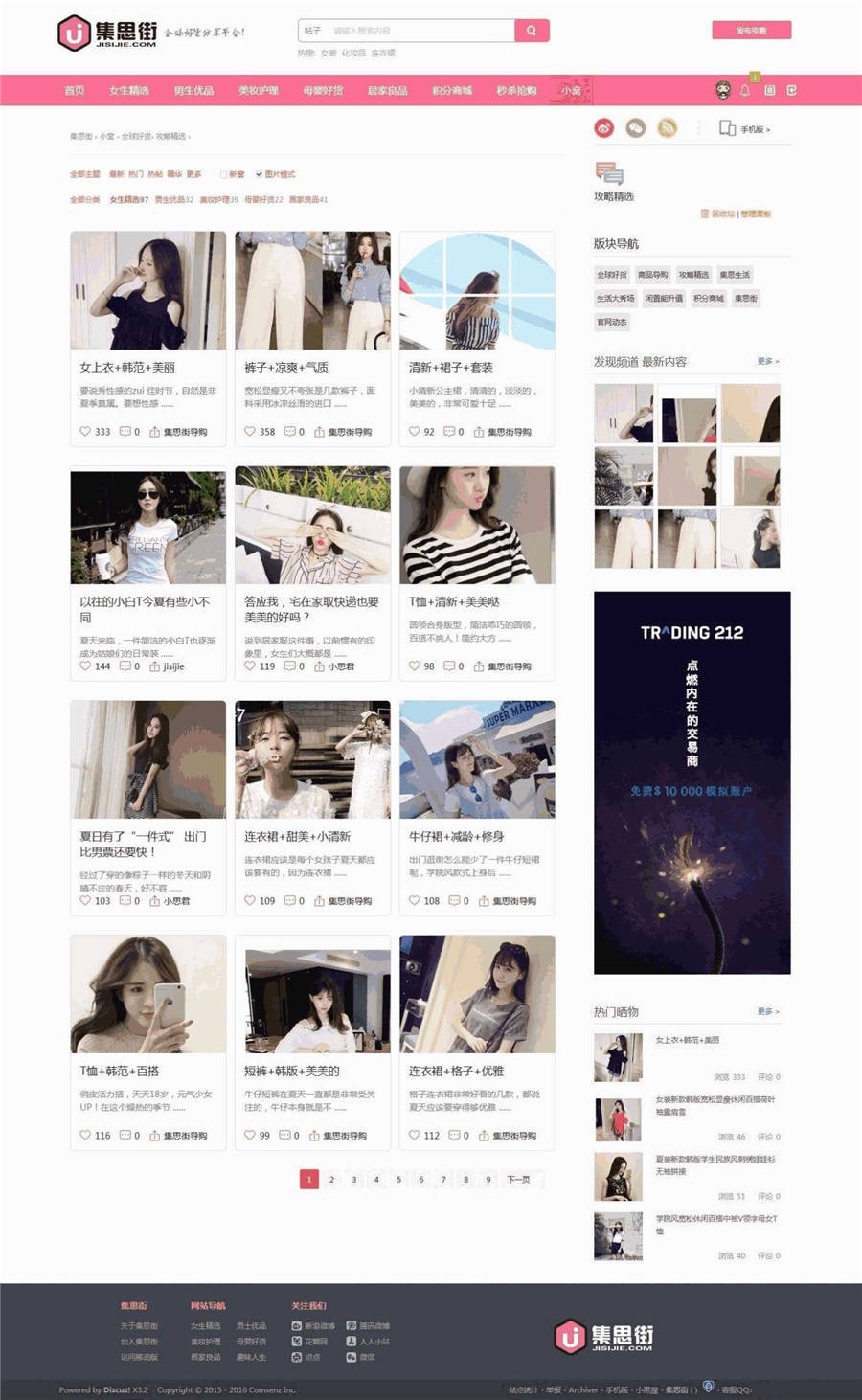 Discuz集思街导购网站模板,淘宝客网站源码,采用DiscuzX3.2内核制作,模板代码优化完善,大气唯美,粉红色更贴合女性类的淘客商品推广。