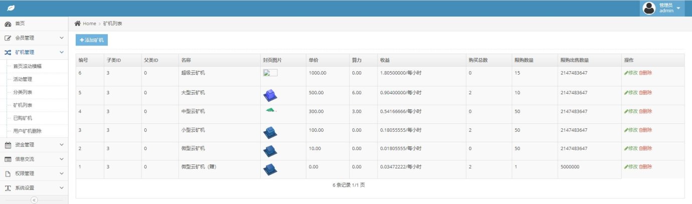 以上这些就是我所测试到的东西,接下来,还有用户注册、矿机收益什么的,要么是需要有条件才能测试的,要么就是要等很长时间才能完成测试的,这些我就不继续体验了,源码的情况大致就是这样了,有兴趣的下载去研究学习吧,介意者和小白请慎下!下面我把我的测试截图发布出来给大家参考。