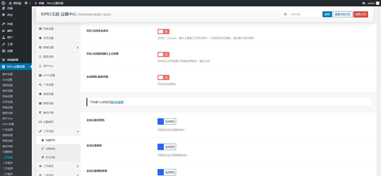 5、看ripro主题设置最下方是否有二开功能,有,恭喜您。安装好了。如果没有或者网址颜色变灰请按步骤5操作